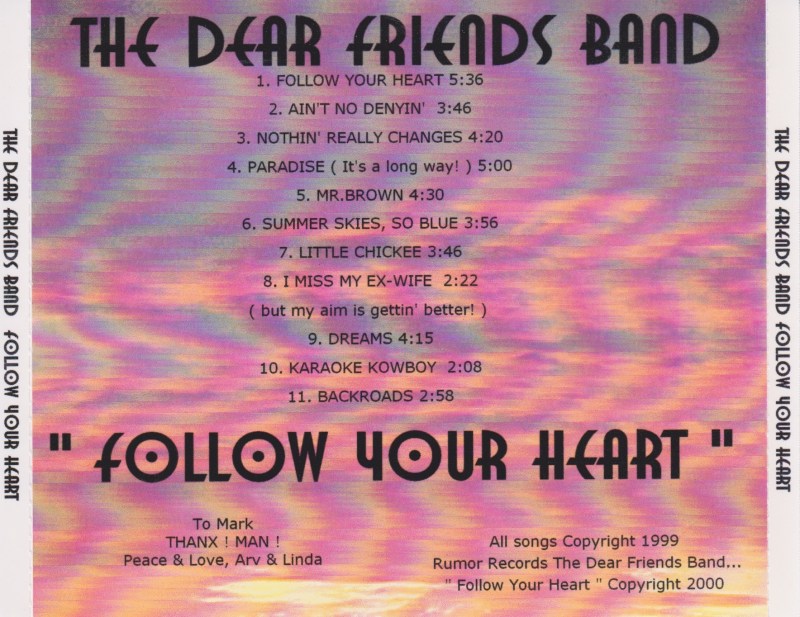 For good ol’ down home heart-felt Rock’n’Roll, Arv Jarzemkoski and his Dear Friends Band offered one of my most fun projects in the recording of their album “Follow Your Heart”. Arv produced and led his crew through his original compositions with a spirit and verve that was palpable through repeated listenings. Highly recommended!