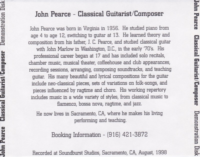 One of the most talented guitarists I had the pleasure to work with was John Pearce, who recorded a couple of projects at the studio, and was poised to do more, but these were among the last client sessions I booked before departing from Sacramento. His first was this demo: