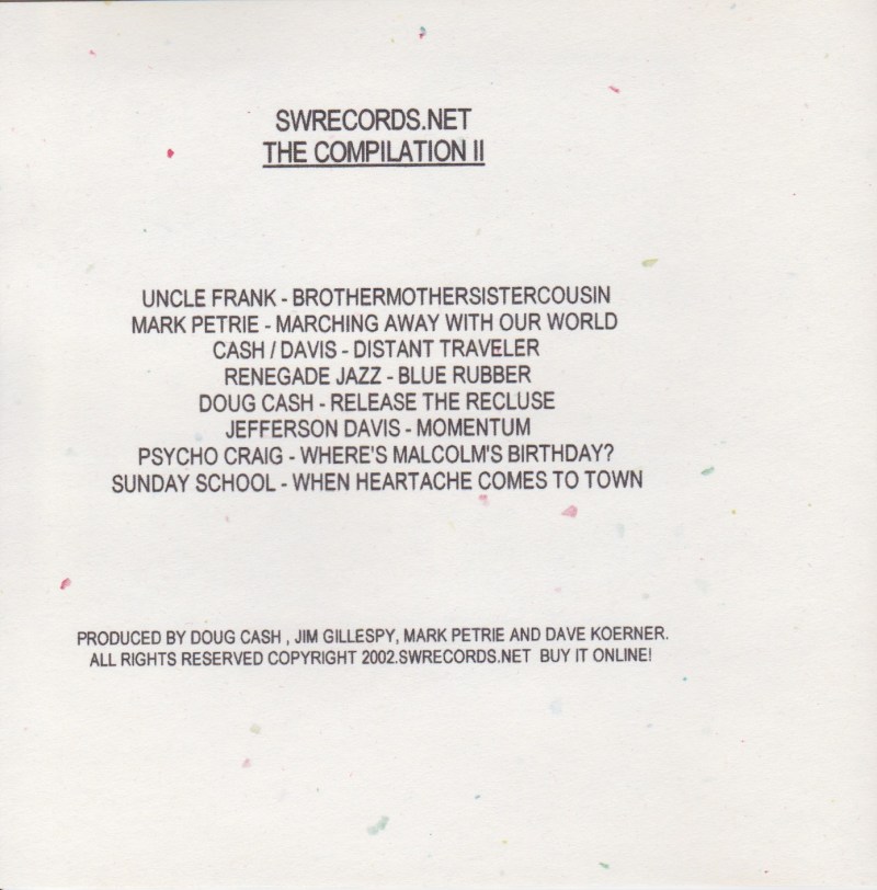 One of the mainstays throughout the Soundburst saga was Doug Cash, an amazingly proficient musician/singer/songwriter who recorded many a track at the studio under various alter egos, all promoted through his website SWRecords.net. The music was eclectic and ran the gamut from blues to pop to experimental. I owe a debt of gratitude to Doug, because of his streaming of one of my songs on one of his collections, I was able to secure my membership with ASCAP. Here is some artwork from a couple of his projects: