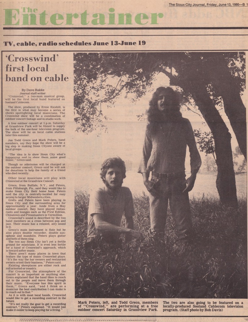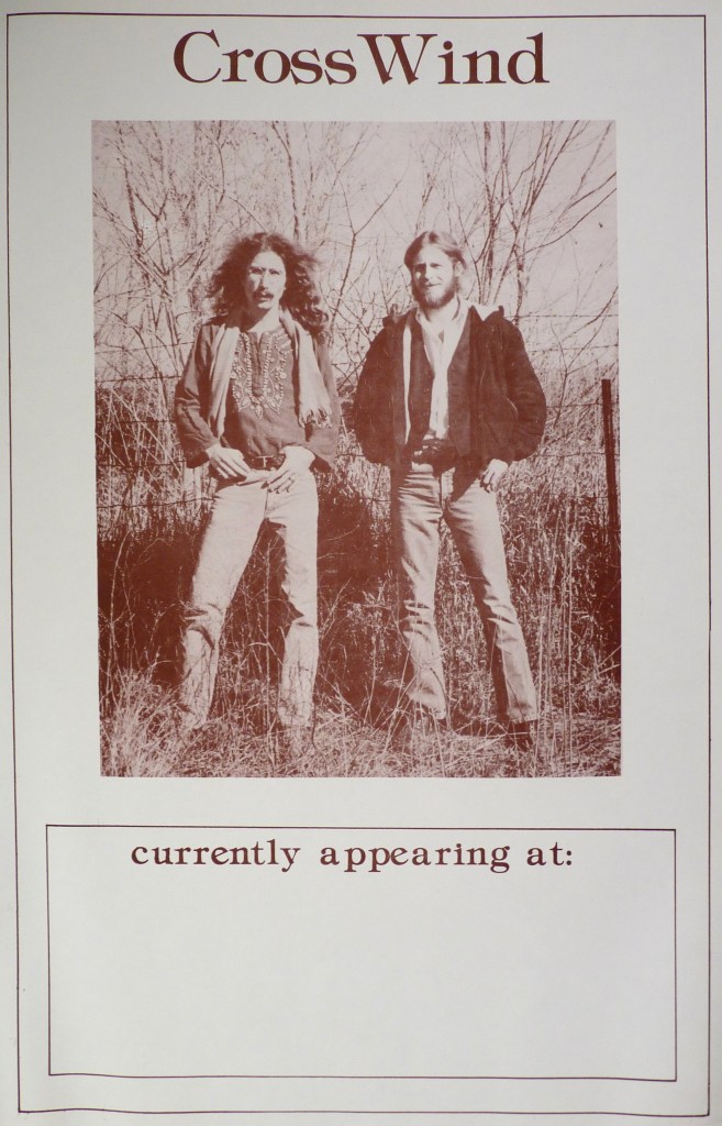 Of course there were quite a few musicians in the piano tuning program at WIT, so after hours we were jamming a lot, and soon I was performing in a duo we named “Crosswind” with Jon Todd Greco, a Buffalo NY native, who played flute, mainly, but also mandolin and guitar. We’ve been friends ever since. Here’s a couple of our posters: