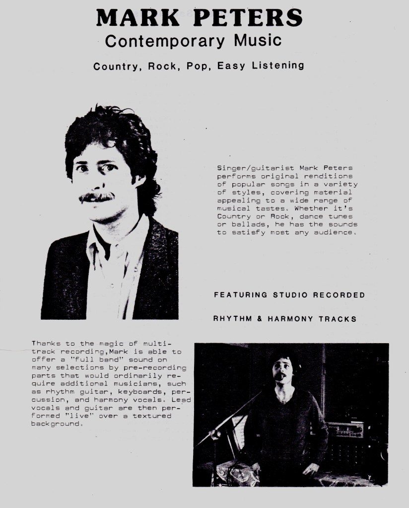 After the Smithland Band, I decided to go solo, singing and strumming my guitar in small town bars and restaurant lounges around Iowa. It was then I decided to adopt the stage name of Mark Peters, mainly because I was on unemployment at the time and didn’t want the state to know about my measly cash income.