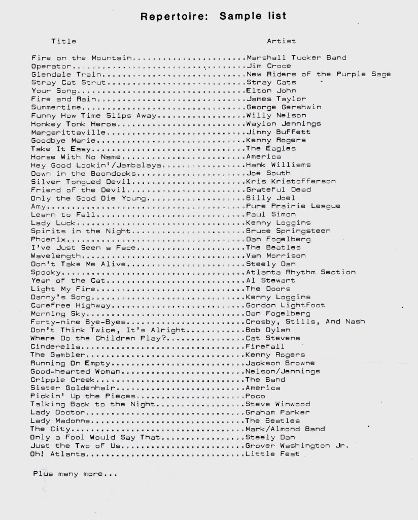 I bounced between Sioux Falls, South Dakota and Sioux City, Iowa for a few years, working various day jobs and gigging nights and weekends whenever I could, usually as a solo, and by this period I had acquired a Tascam PortaStudio (4 track muti-channel cassette recorder) that I would record back-up tracks on and then sing and play the lead parts while performing along with the tape. This was unusual for the time, and I got some pretty nice jobs with that routine, most notably with residencies at a modern architecturally interesting Holiday Inn in Ames, Iowa, and a ski-resort themed restaurant / lounge in Sioux Falls called “The Northlander”. Here is a poster I was using around this time that was designed by my bass-player / graphic artist friend Neil Isaacson, who also played on my demo: