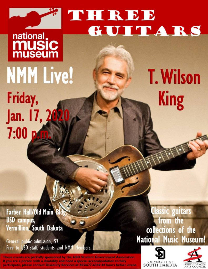 Actually, I didn’t do too bad for a novice. It was during this period that I also started collaborating with T. Wilson King, later to become “South Dakota’s King of the Guitar” and ambassador for the National Music Museum at the University of South Dakota, Vermillion. The NMM is one of the most renowned institutions of its kind in the world. With more than 15,000 musical instruments, the NMM’s collections are among the best anywhere.