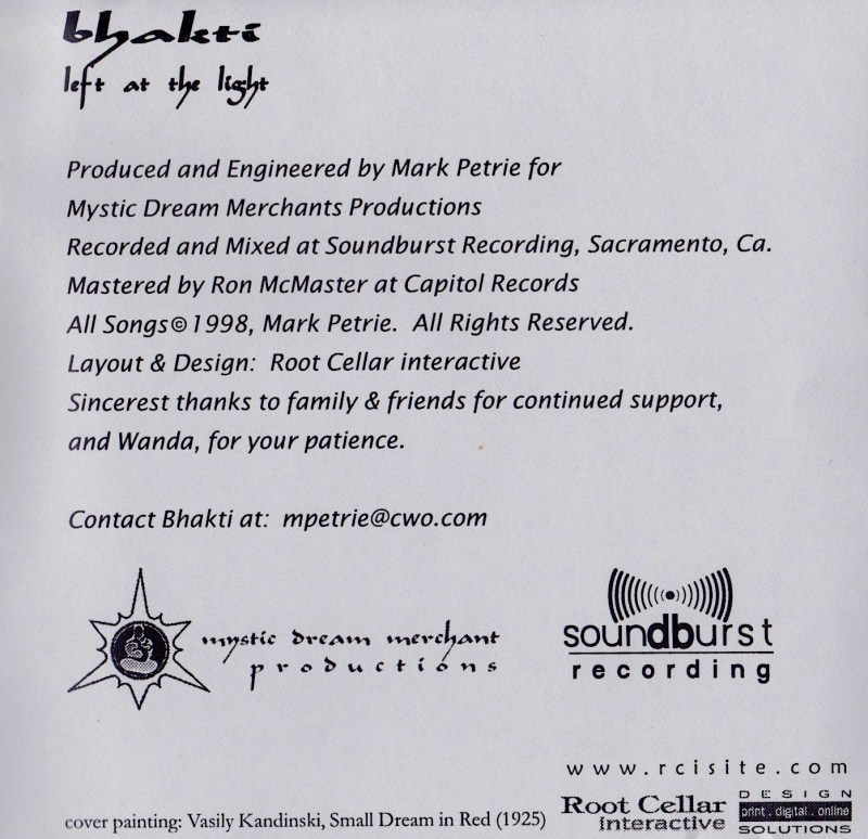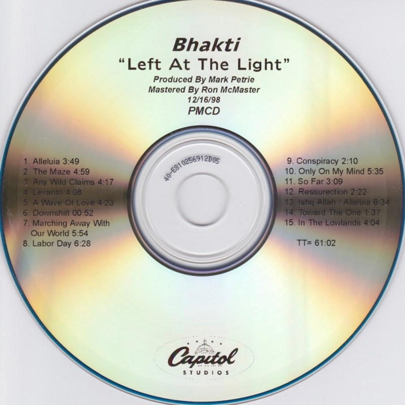 Left At The Light was my first album, recorded at my new studio in Sacramento, which I called Soundburst Recording at the time, and includes what I thought were the best tracks I had produced at that point. As I mentioned, none of these albums were actually released, (until now; downloadable at the STORE page as Bhakti Station and soon Forevernow) but rather kept evolving, so there are tunes here that appeared on the later albums, some of which may have been remixed or remastered subsequently, but here are presented in their original forms (on this page only), ripped directly from the Capitol masters by Ron McMaster. (Some of the song files on the individual details and lyrics pages are later remasters.)