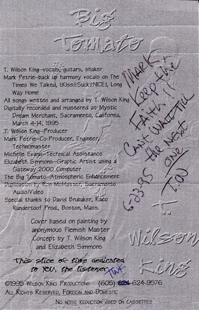 Recording our own personal projects was the main perk in setting up the studio, but we needed to bring in clients to help pay for the equipment, so a good trial run with a professional artist would be just the thing to get our feet wet. I invited T. Wilson King out from South Dakota, and we recorded a full-length album project over the course of a few weeks in the late winter of 1995. I’m sure it was a nice escape from the South Dakota freeze. (I remember the first winter I spent in Sioux Falls years earlier, I stepped out to pick up the newspaper from my front porch, and as my eyes started to glaze over, I saw the day’s headline: “Wind chill factor hits 100 degrees below 0” !!!)